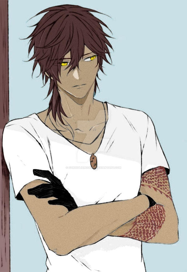 Seine Haare sind von Natur aus feuerrot und seine Augen sind Pech schwarz, außer wenn er wütend wird, dann nehmen sie einen hellen kristallklaren blau ton an.